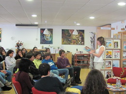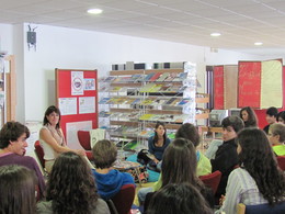 Houve um primeiro encontro, uma primeira conversa, que decorreu na nossa própria biblioteca e que se estabeleceu entre a Ana Saldanha e os alunos das turmas C e D do 11º ano, não sem que um aluno do 7º ano se "infiltrasse" entre eles. Aliás, este aluno em muito contribuiu para a qualidade das questões colocadas à escritora.