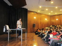 Se esta conversa com os alunos "mais velhos" se centrou, essencial mas não exclusivamente, no livro "Para maiores de 16", a conversa que teve lugar, no dia seguinte, no auditório da Biblioteca Municipal, destinada a alunos dos 6ºs e 7º anos da nossa escola e da escola D. Nuno Álvares Pereira, teve um carácter muito mais abrangente no que toca à obra bibliográfica de Ana Saldanha.
